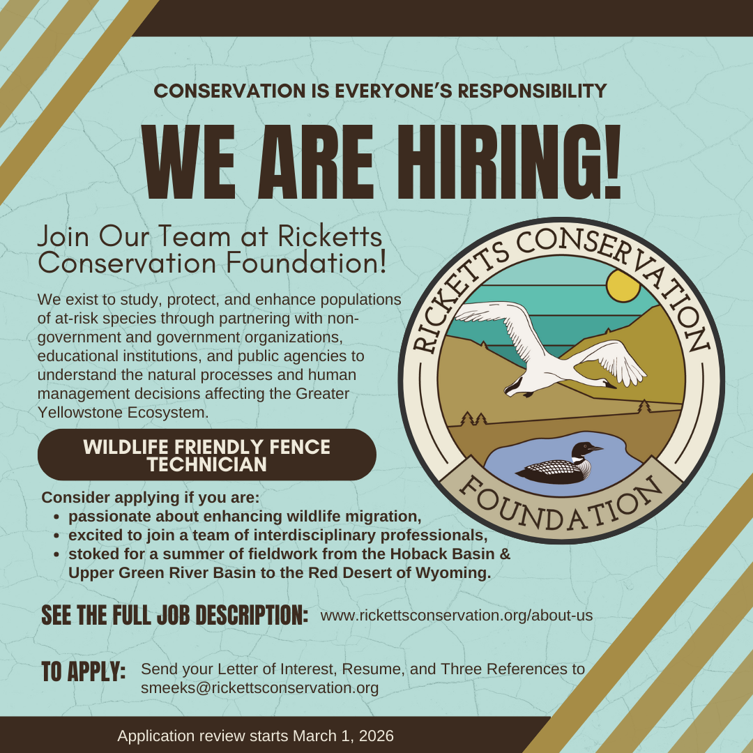 The Ricketts Conservation Foundation, in partnership with the Upper Green Fence Initiative, seeks a Wildlife Friendly Fence Technician based in Bondurant, Wyoming. This position will support the efforts of the Wyoming Game and Fish Fence Program Manager and the Upper Green Fence Initiative. This position will be responsible for fence inventory which will inform future removal or conversion to configurations more suitable for wildlife. This work will expand upon an already high producing program that has funding, partnerships and landowners eager to do projects. Extensive presence in the field is necessary across a large area ranging from the Hoback Basin and the Upper Green River Basin to the Red Desert in Carbon, Fremont, Sublette, and Sweetwater Counties. This position will require the development of working relationships with other Ricketts Conservation Foundation employees, Wyoming Game and Fish employees, other state and federal agency personnel, local landowners, sportspersons, and non-governmental organizations to identify and implement fence improvement projects across all land ownerships within priority wildlife habitats.